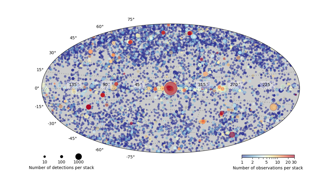 As can been seen from the figure below, the exquisite performance of Chandra’s X-ray optics enables the CSC to excel in crowded regions of the sky. Left : The figure shows a cutout of a roughly 3 Ms observation stack (a co-add of 86 observations) from CSC 2.1, centered on Sgr A* (2CXO J174540.0-290028; identified by the cross), the supermassive black hole at the center of our Galaxy. Color is based on mean photon energy in a pixel (softer, less energetic photons are red, harder, more energetic photons are blue); the vertical blue bar visible in the center of the field is an artifact of summing multiple observations. Right : The positions of roughly 3,300 X-ray point sources in this region from CSC 2.1 are identified. This is roughly a dozen times more X-ray sources than have been detected by other missions, which cannot match Chandra’s superb imaging capabilities.